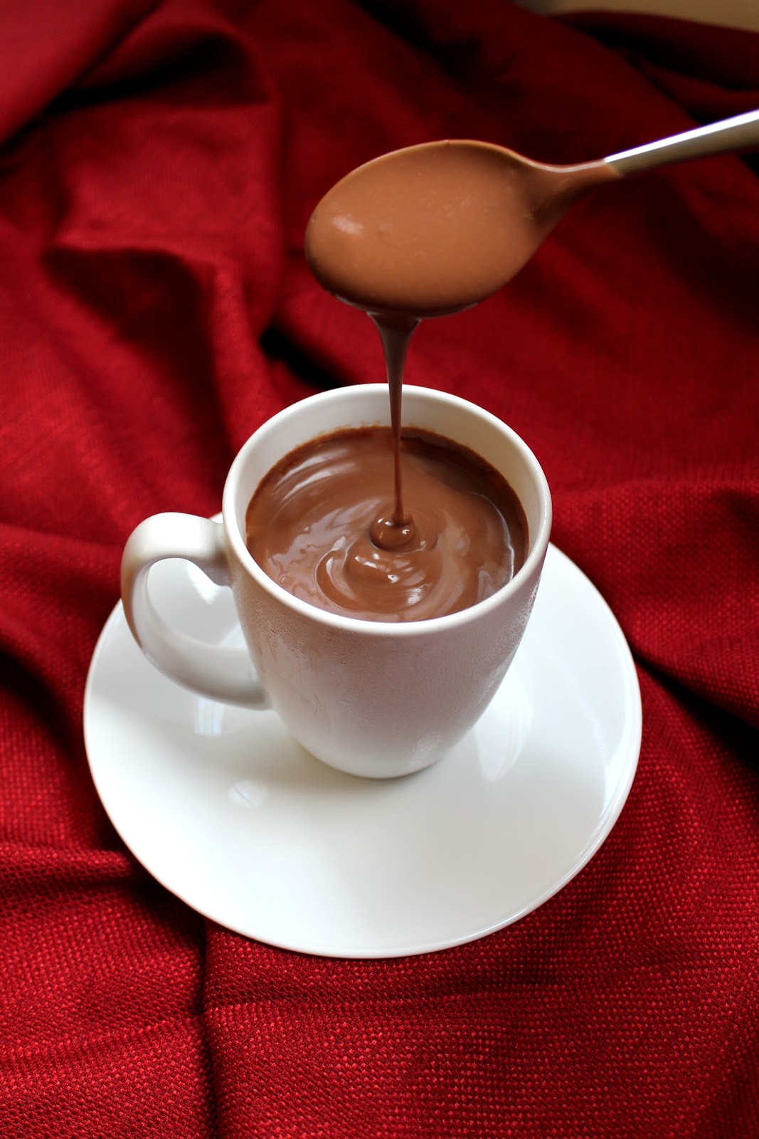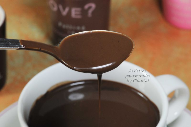Dump ½-cup of chocolate chips into a very big coffee mug or a 16-oz glass measuring cup. Add ¼ cup milk. Nuke for 1 minute. Stir thoroughly, to encourage the chips to melt. Add another ¼ cup of milk. Nuke for 30 seconds. Stir thoroughly once again. Add another ¼ cup of milk. Nuke another 30 seconds.