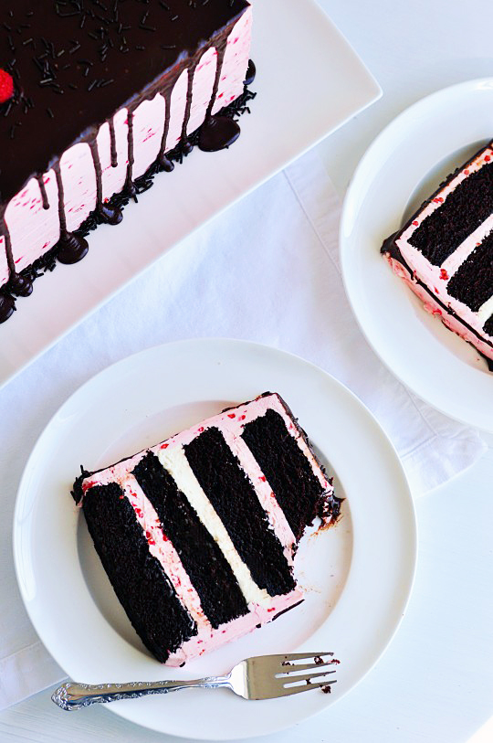 [3] Tester: In my experience, the success of this and most other from-scratch cakes rests on about a 60-second window of opportunity. You need to remove them from the oven PRECISELY when they’re done. A minute in the wrong direction will take you from bliss to blech. You need to take raspberry mocha cakes out as soon as the toothpick comes out dry, and the only way you’ll know that you’ve nailed the “as soon as” part is if your first dip comes out wet. If you even suspect that you’ve overbaked these cakes, spare yourself the wretched anxiety and infuse them with a simple syrup just in case. As soon as you’ve placed the cakes on the cooling racks, prick the hell out of them with your trusty toothpick. Then brush them liberally with syrup. (Lightly flavor this syrup with raspberry, and you’re one clever bastard.) Just before frosting, invert the cakes and perform the same procedure on the bottom of each. Don’t worry about marring the cakes as you do this; that’ll get covered up by the frosting.