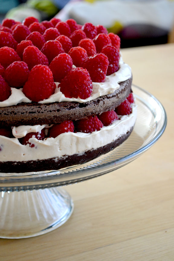 [4] Perimeter: According to my tastes, I’d do this on along the perimeter of the top layer only if that layer were flat. A magic strip won’t help you here. This cake rises by a dark magic that cannot be undone by stripping. You’ll have to level the layer with a knife. Or a sword, if you’re Zorro. If you want to leave the cake domed (which is actually my preference), ring the raspberries around the base of the cake.