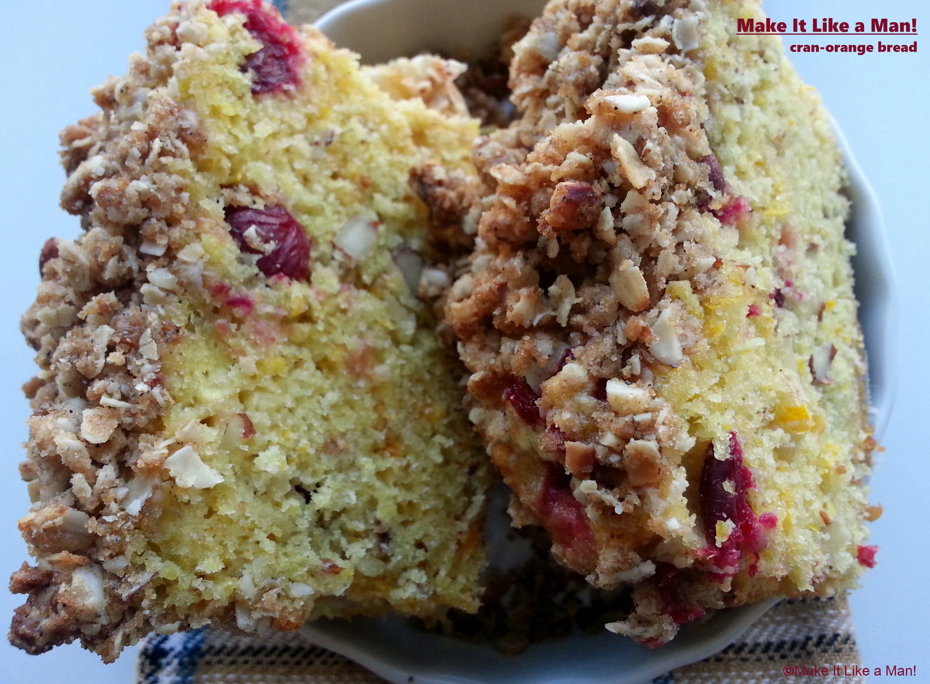 1. In a small mixing bowl, stir together all topping ingredients. Set aside. 2. Butter and flour a standard-sized loaf pan.[3] Set aside. 3. Combine dry bread ingredients in the bowl of a stand mixer. 4. Preheat oven to 350°F. 3. Slice orange into sixteenths. If your orange has seeds … how weird. Remove them. Purée orange chunks in food processor. (If the orange doesn’t puree on its own, add some of the shortening to the processor.) Combine purée, shortening, and eggs. Mix into dry ingredients just until blended. Fold in cranberries and nuts. 5. Turn batter into pan. Massage the topping a bit with your fingers to break up any clumps. Sprinkle ½ to ⅔ of the topping over the batter. Press the topping into the batter, leveling the batter as you do so. Then add the rest of the topping, without pressing. 6. Bake 60-70 minutes. A tester may come out with a few, tiny, moist crumbs, but not with any liquid batter whatsoever. You have to test it in four or five locations to be sure with absolute confidence that it’s done. 7. Allow loaf to cool until you can easily handle it with bare hands. Depan thusly: cover the loaf with a tea towel before flipping the pan, bundling the loaf and pan fairly snugly. That will help keep the topping in place. Invert the pan, place it on one end of the rack, gently shake the bread out of the pan, fold the towel back, and gently roll the loaf upright, onto the other end of the rack. Allow loaf to cool fully.