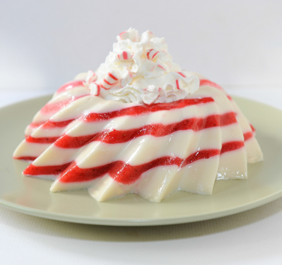 - Unmold and serve. To unmold, work your way around the edge of the pan, gently pulling the Jell-O away from the pan. Then, dip the pan – as close to the lip as you dare – into a sink filled with moderately hot water, for 10 seconds. Place a serving plate upside down, over the pan. Invert and give the pan a couple smacks before carefully lifting the pan off the Jell-O. When slicing portions, if you use a serrated knife, pushing it directly down through the Jell-O without any kind of sawing action, you’ll produce a pattern in the slice that complements the Jell-O ribbons. If you use a smooth blade, your slices will have a smooth finish, which is also quite attractive.