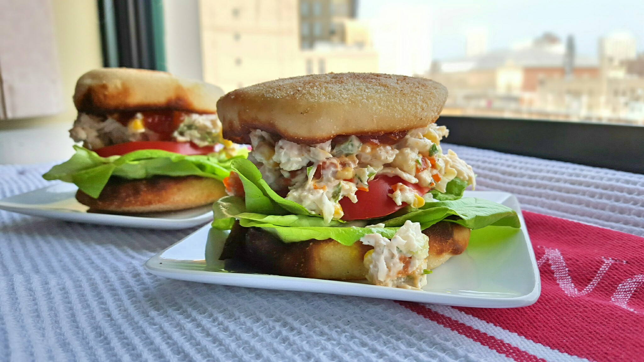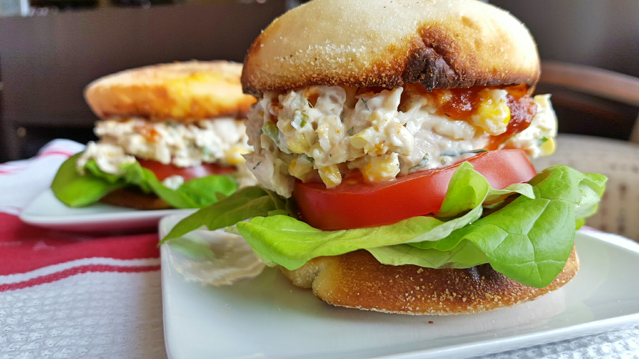 - Build each sandwich with a thick layer of lettuce, a slice of tomato, and a generous 1/3-cup chicken salad.