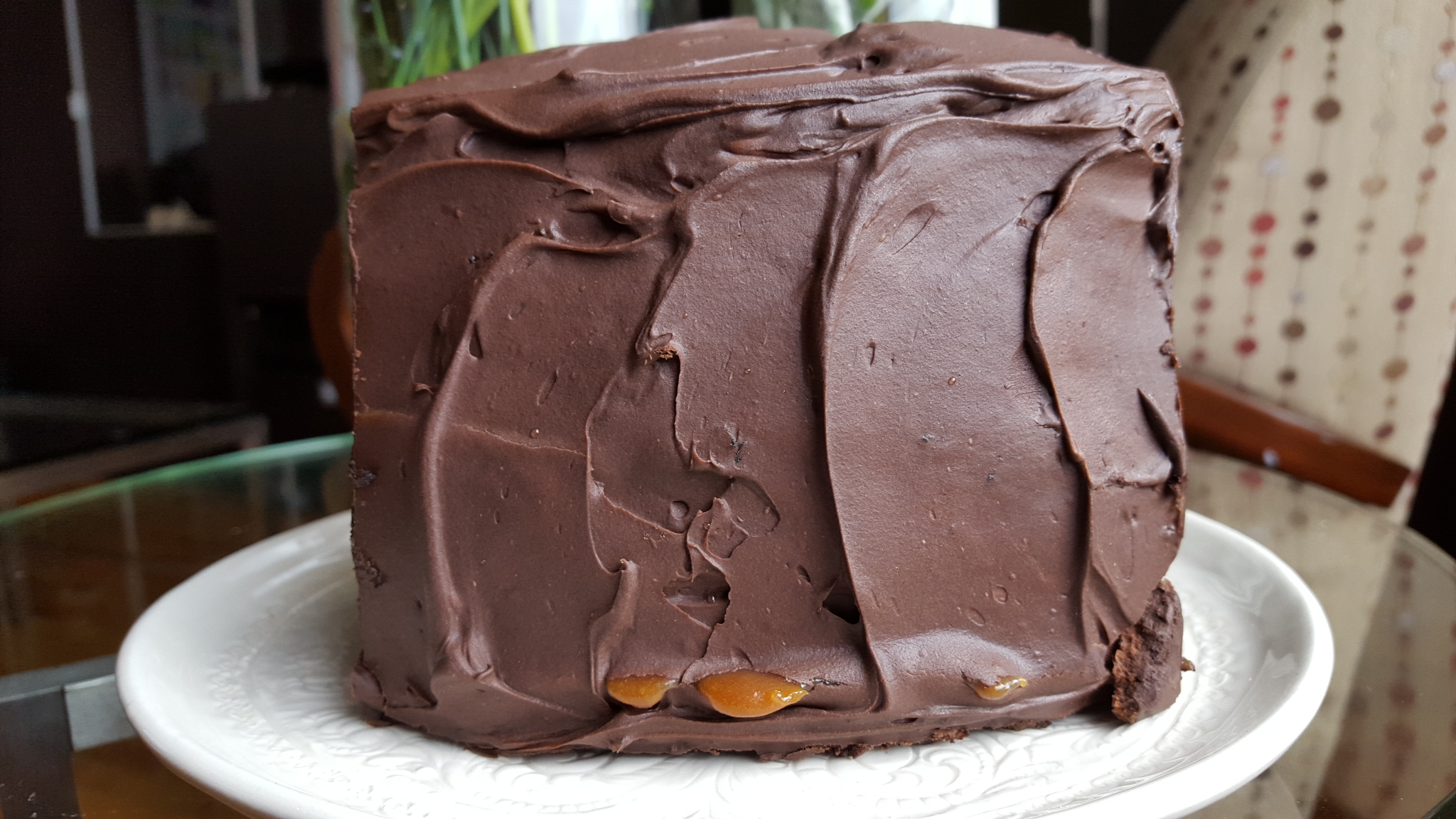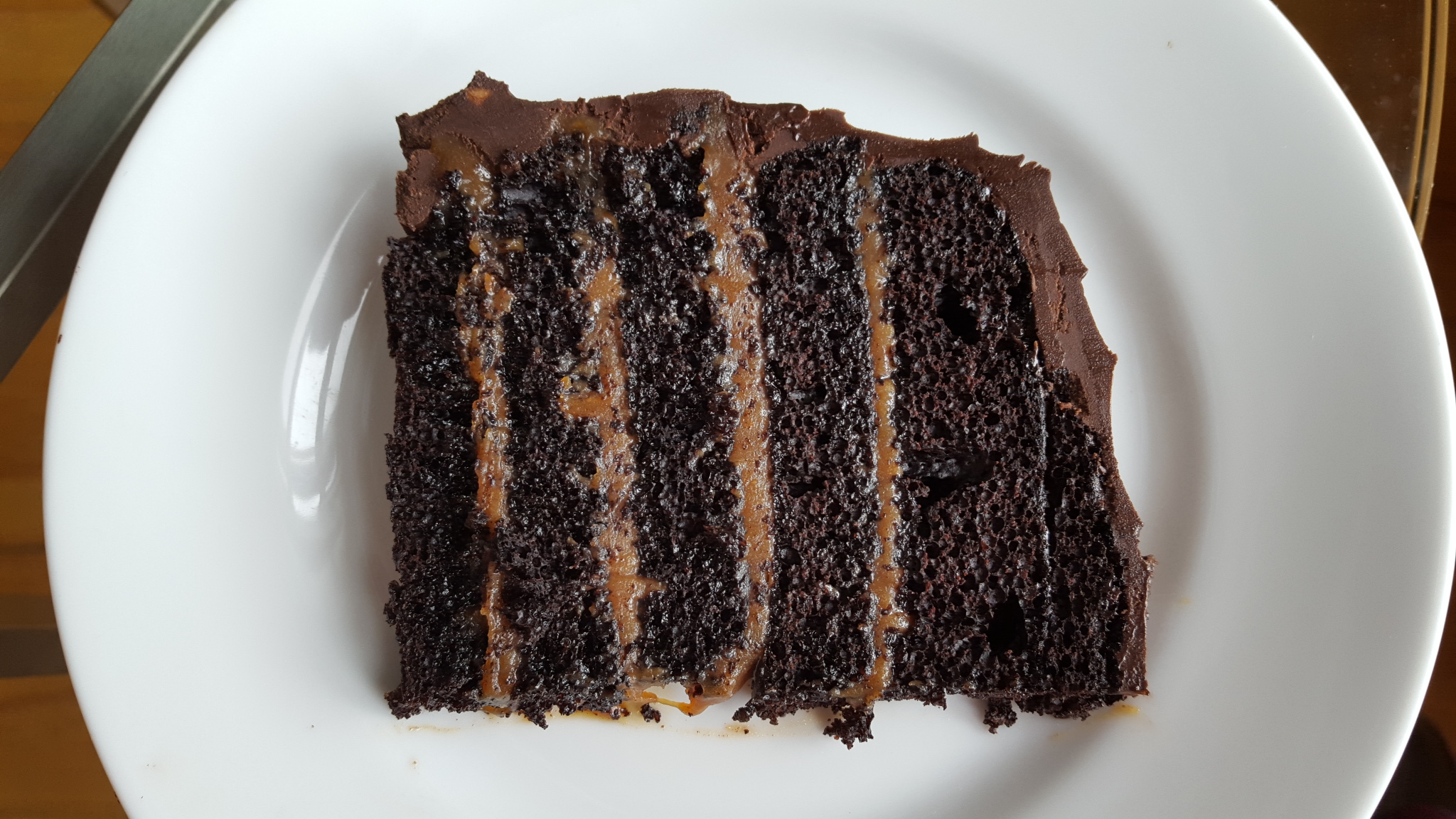 Notes: Making the caramel doesn’t take long. However, if you’ve never made caramel before, this cake is going to be quite an adventure. Read up on it, because there’s something of an art to caramel making; it takes practice and makes use of insider tips. You want a darker amber than you’d probably achieve if you were making typical caramel or caramel sauce. That way, it will stand out against the chocolate cake. When you pour in the cream, it will not just spatter, it will appear as if a strange alien creature is about to emerge from the bubbling, gurgling mixture. The temperature is critical: a degree under, and your layers will not adhere to one another. Instead, they’ll slide off of each other in a grossly disappointing failure. A degree too hot, and your finished caramel will be too thick to spread without destroying the cakes. When it comes to incorporating the butter, I find that it’s not necessary to cool the caramel beforehand; indeed, it can assist in the cooling process. You can get away with adding the butter in larger increments – or even all at once – so long as you’re willing to stir the hell out of it. Once your caramel is made, time really and truly is your friend. I recommend that you let it rest overnight in the fridge, and then allow it a few hours to come to room temperature before using. Why? Because you need it to be thick. If you allow it to cool to room temperature, chances are it will be on the hot side of room temperature when you try to use it, which will increase the likelihood that the layers will slip off of one another. If you allow it to warm up to room temperature, chances are it will be on the cooler side when it comes time to use it, and this is better. Even if it’s a little hard to spread, your layers will adhere.