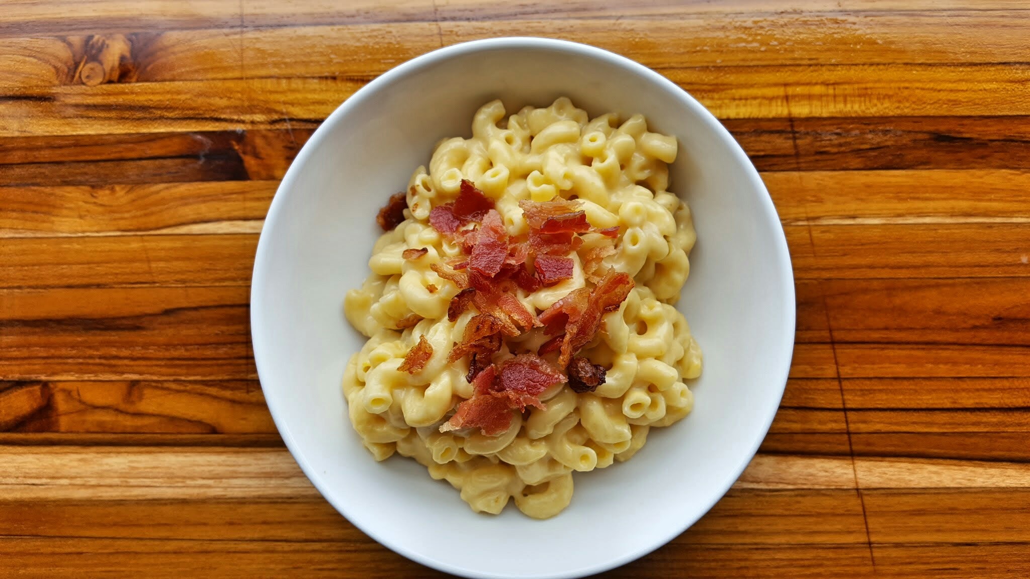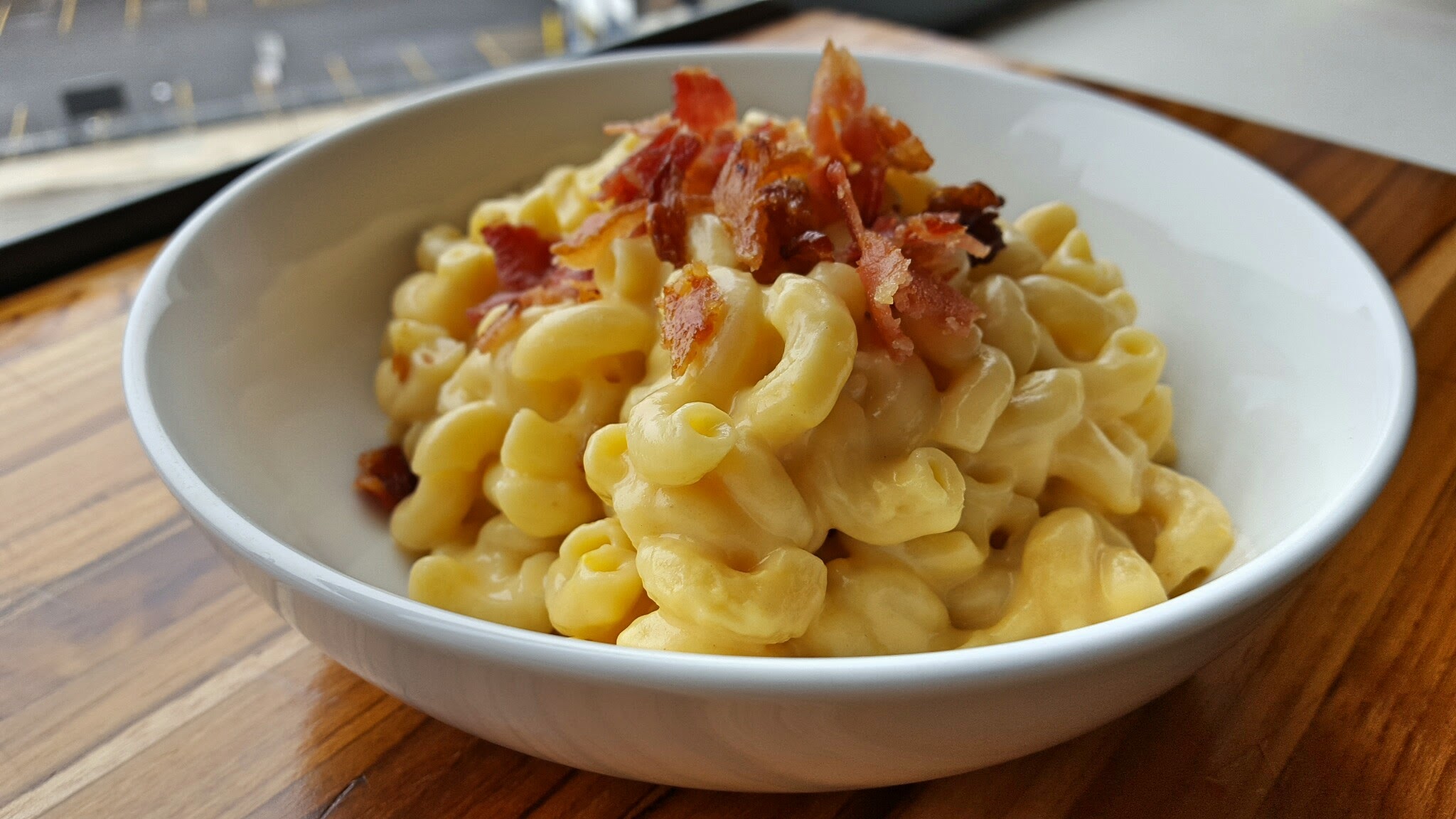 6. Pour the sauce into the (empty) pot you used for the macaroni. Add the macaroni, and toss. Serve immediately, garnished with bacon and pepper.