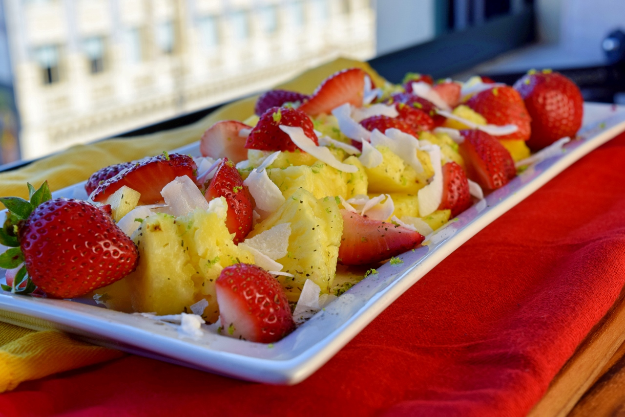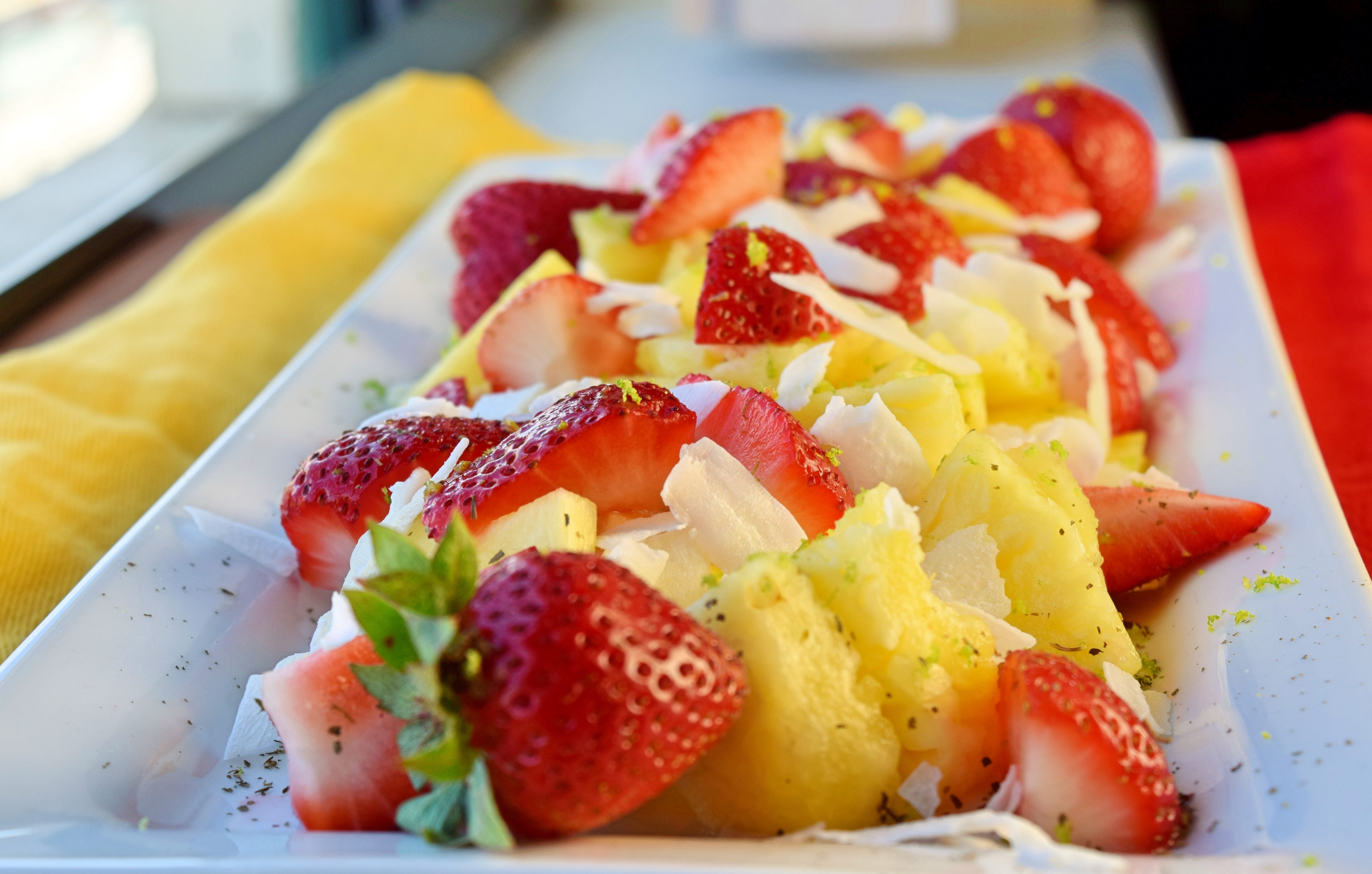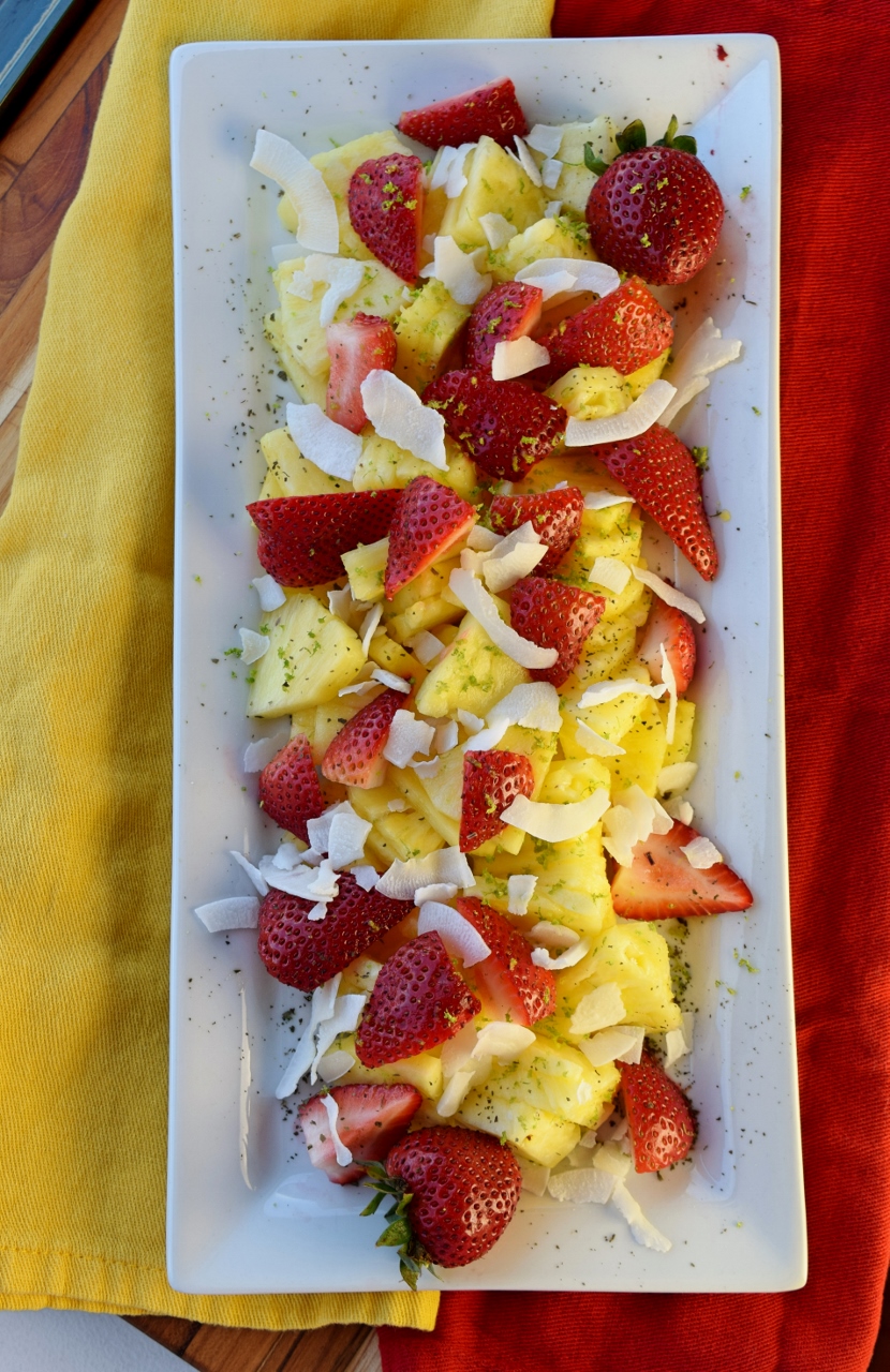 It’s beautiful. It’s not as though you haven’t seen a plate of fruit before, but the zest and coconut dress it up. The lime not only looks nice, but pairs beautifully with the pineapple and magically sweetens up the strawberries.