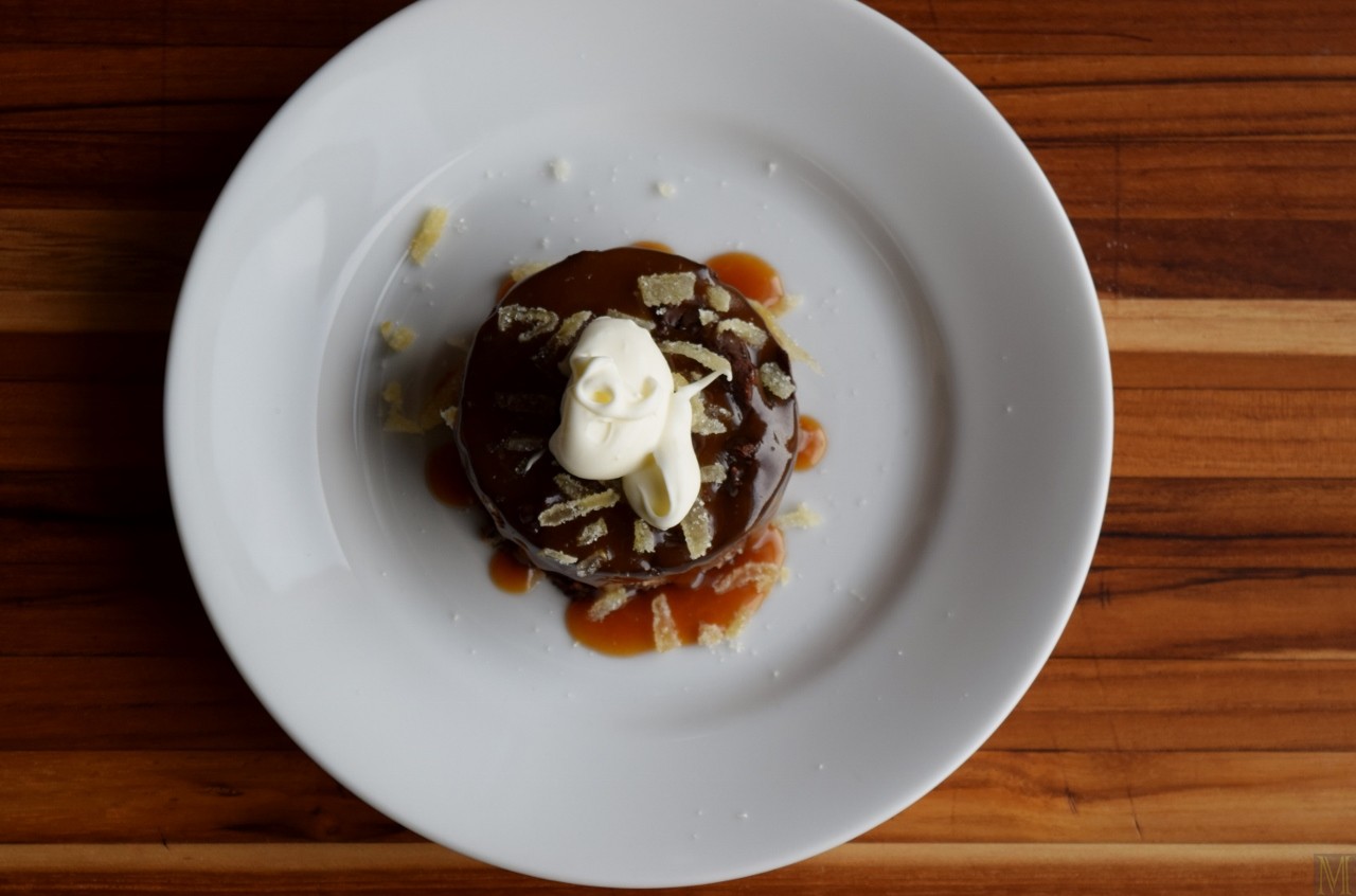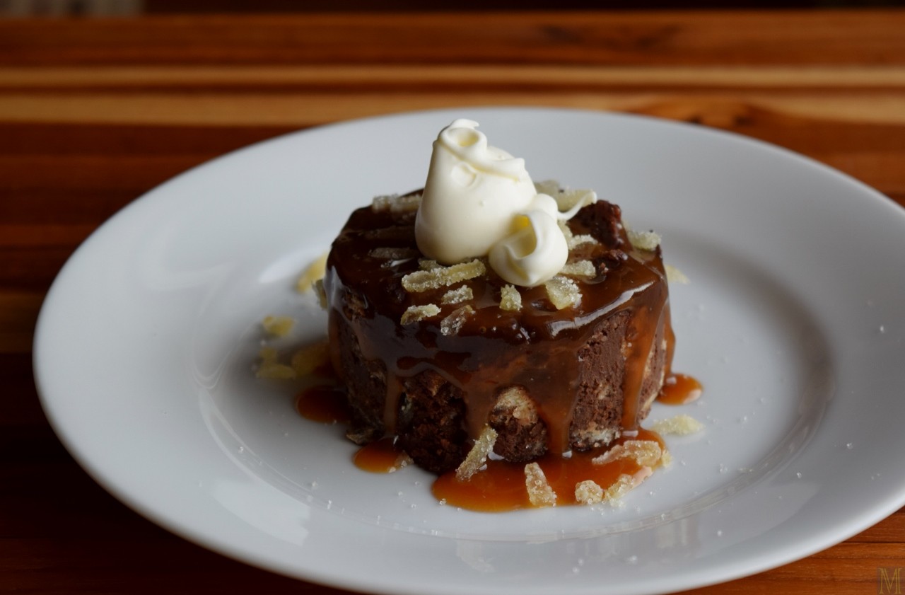 Dark Chocolate Bread Pudding with Crystalized Ginger, Caramel Drizzle, and Crème Fraîche