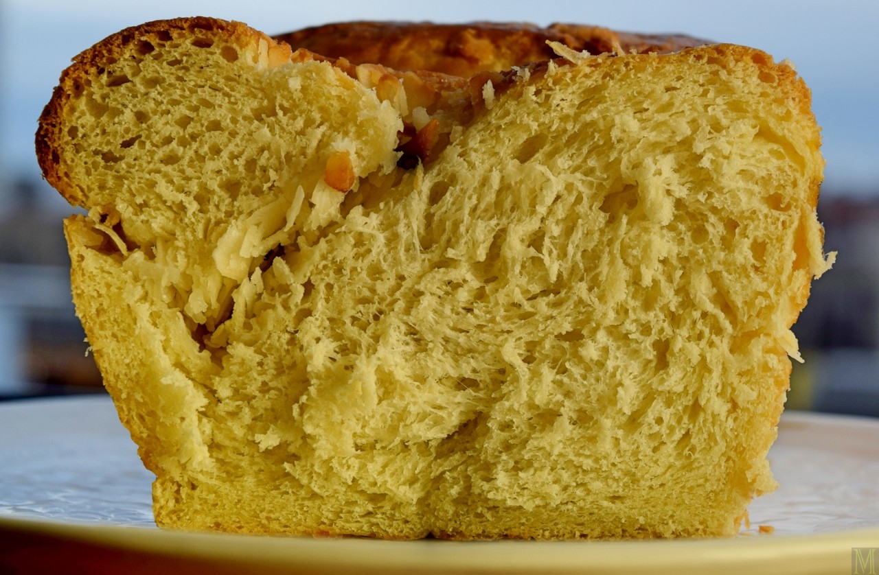 Why I associate Easter with coconut, I can’t tell you. On the Sunday after the first full moon of spring, many people’s thoughts turn to chocolate bunnies and jelly beans … mine turns to coconut cake. But it also turns to babka. Sweet breads are a traditional staple of a Polish Easter menu, so my thoughts usually spin that way not long after registering a hankering for coconut. This year I guess I whipped my thoughts around a bit quicker than usual, and the two ideas fused. And I’m so glad they did! This coconut babka turned out beautifully – and I do mean beautifully. I think it’s one of the best things I’ve ever made. The crumb is reminiscent of a croissant: buttery, soft, pillowy. The crust, flaky. The flavor is mildly sweet. The coconut is crunchy and appealing. The color is fantastic.
