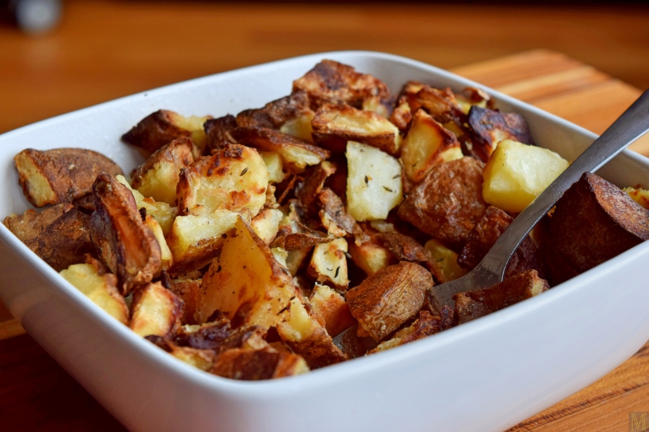 If the fat has hardened, melt it. If it’s shy of the required amount, supplement with melted butter. Strain the potatoes. Spread them onto sturdy, rimmed baking sheets. Pour the fat evenly over them, and toss roughly. Sprinkle generously with salt, modestly with pepper, then with the thyme. Bake for 20 minutes, swapping rack positions half-way through. Remove from oven and flip or toss them. Return to oven for another 20 minutes, with another rack switch at the half-way point. The potatoes are done when they are decidedly brown and crispy.