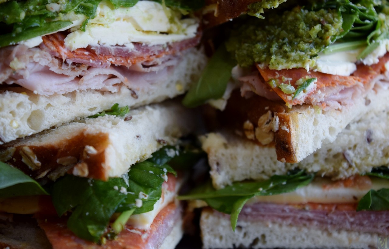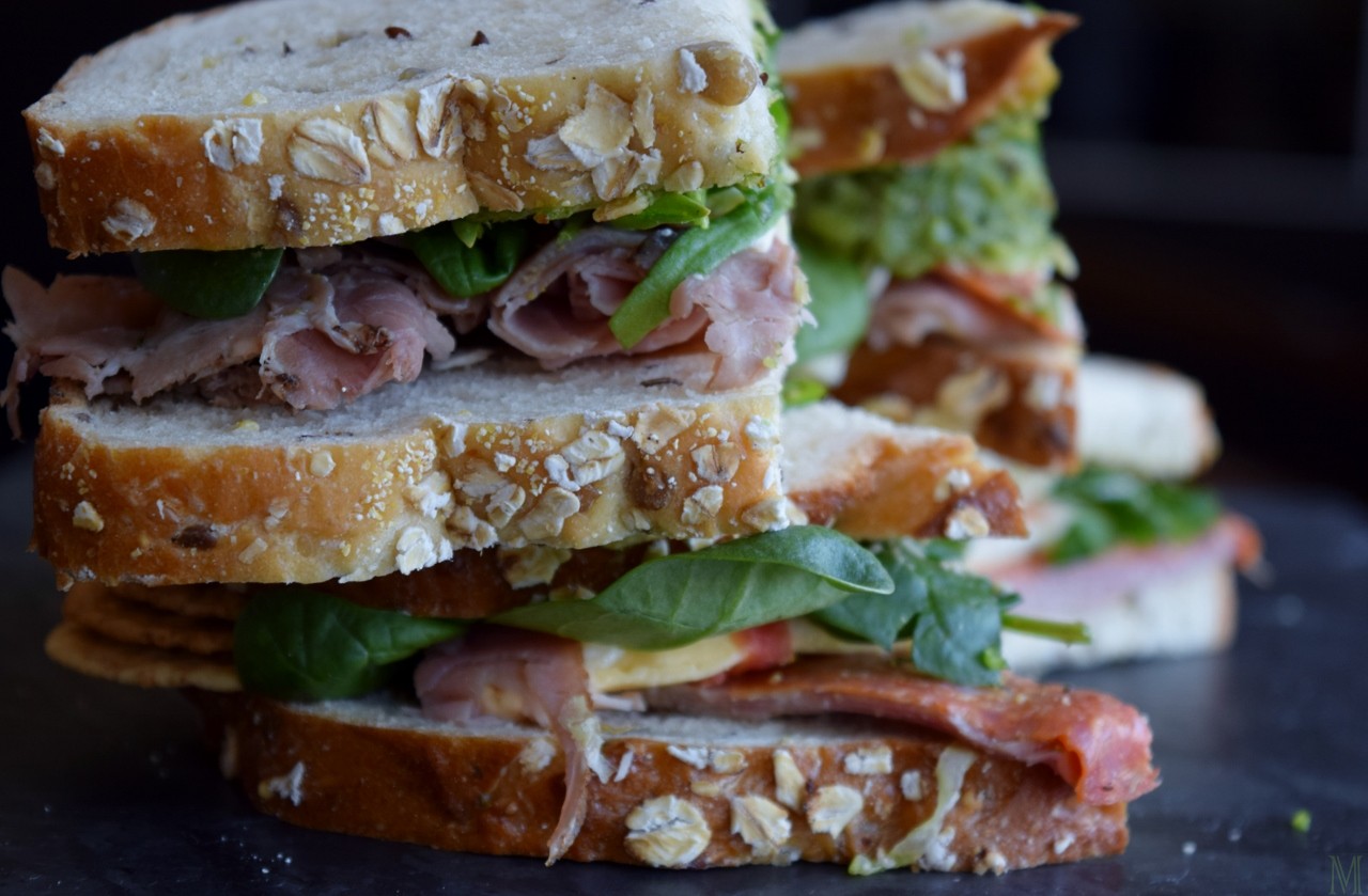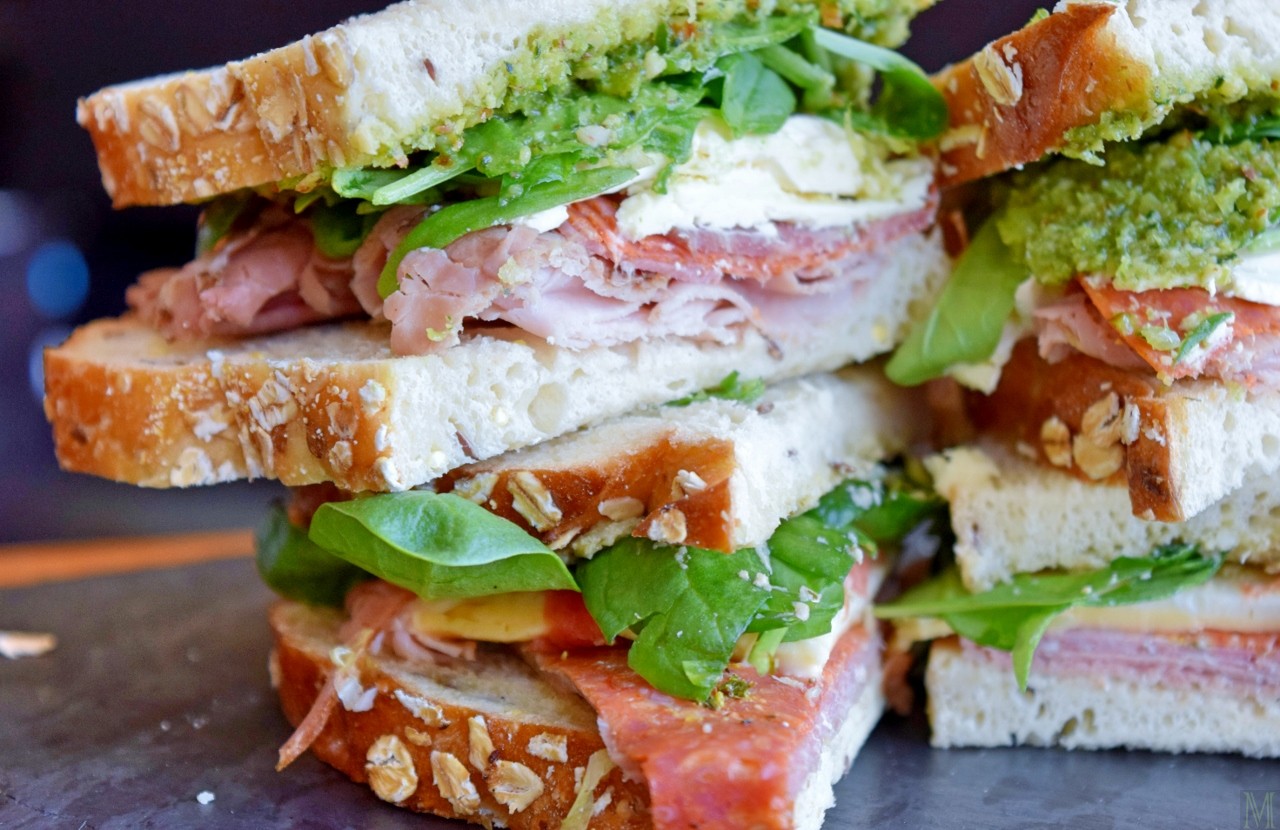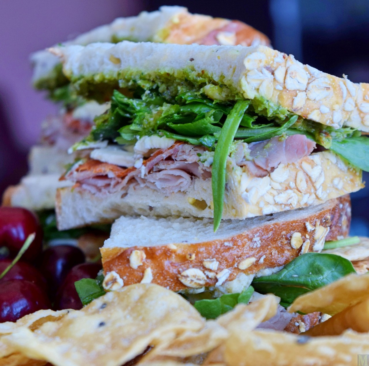 So, I relocated the meats and cheese to a couple slices of Crunchy Grain Bread. (Today’s Temptations makes it; their breads are stellar, and I mean stel-lar.) The meat that was once two-thirds of an outrageously generous sandwich was enough for two new, completely reasonably-sized sandwiches. Next, I scoured the fridge to see what I could add to them. I wound up spreading one of them with basil pesto, and the other with artichoke pesto (because, yeah, that’s the kind of stuff you find when you open my fridge). There was only enough leftover cheese for one sandwich, so I layered the other one with brie (because, yeah, that’s also the kind of thing you’ll find when you open my fridge). Topped if off with fresh baby spinach, and as a final touch, gave them both a thin spread of Dijon. A bag of Maya Kaimal Chickpea Chips and some black cherries, and I had lunch for two. It was so easy, I’m sure even the Contessa wouldn’t bother asking, “How easy is that?” (After taking these pictures, I realized I had some bacon slices, and so of course, they went in there, too.)