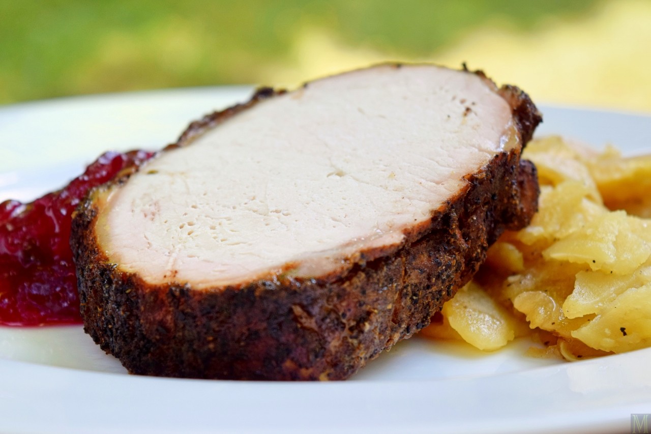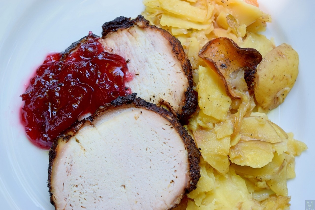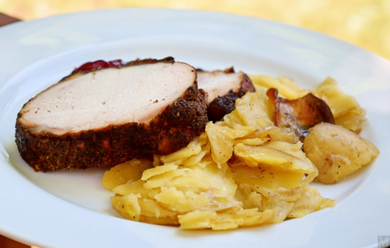 Remove the finished roast from the grill and let it rest, tented with foil, for at least 10 minutes. Remove the potatoes, too – but they don’t need tenting. You’ll find that the potatoes’ texture varies, with crunchy bits on the top, and luxurious, melt-in-your-mouth bits at the bottom, so dig your spoon deep when serving. Cranberry or applesauce make good accompaniments for the pork.