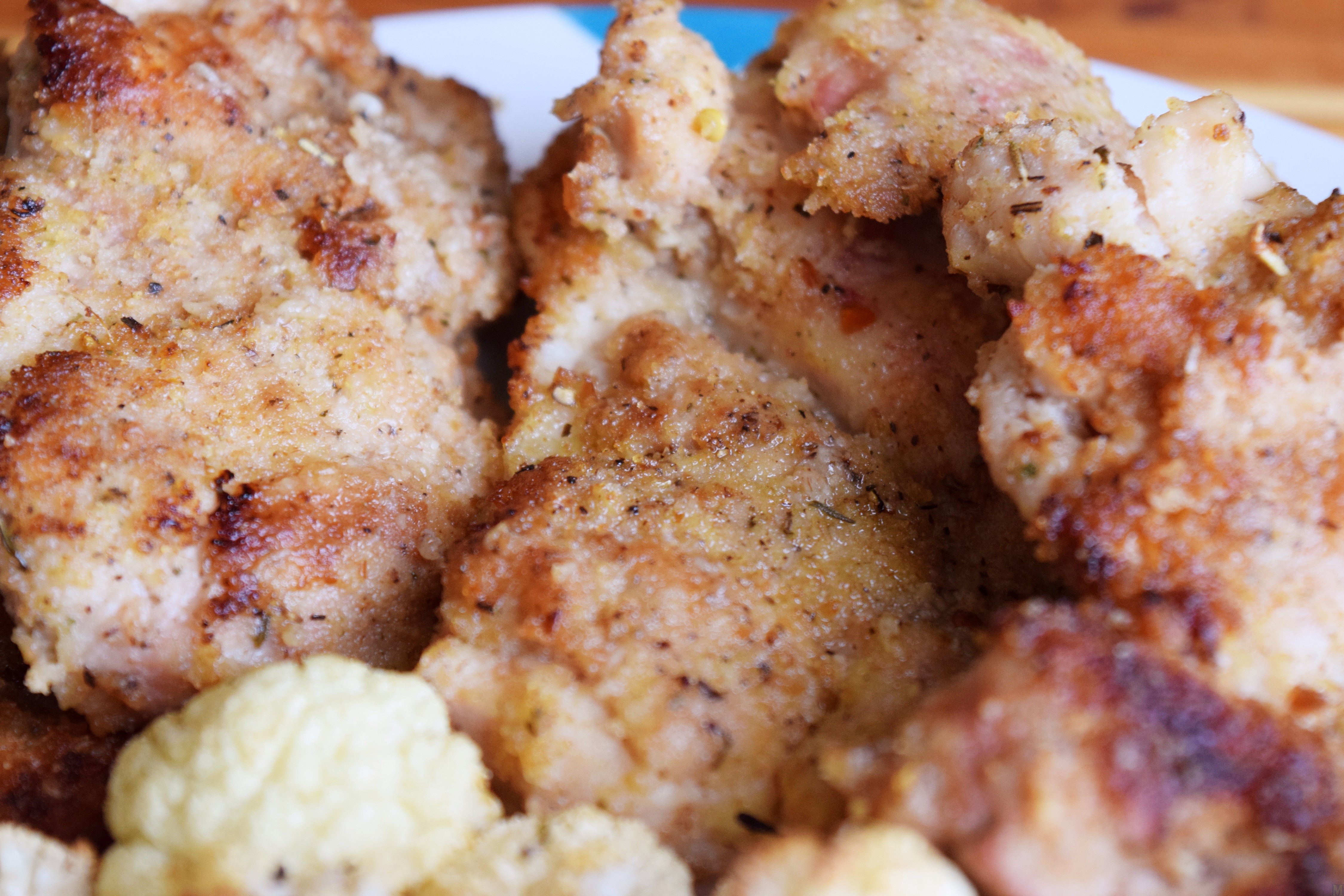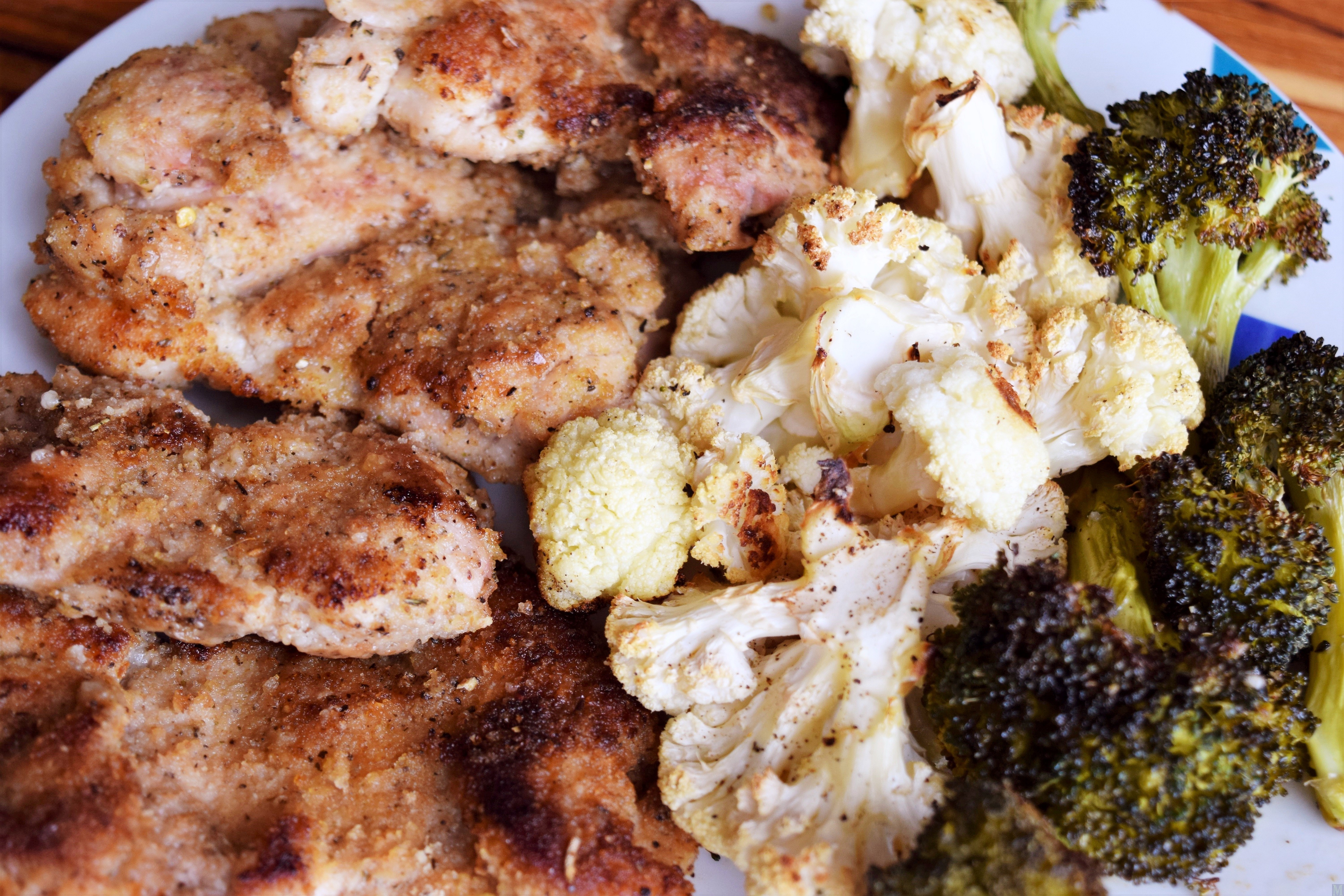 I would definitely use chicken thighs here..so much more flavourful and juicier..a great contrast with that crunchy crust. Happy to see that you have paired this with the broccoli and cauliflower, which my husband absolutely hates!