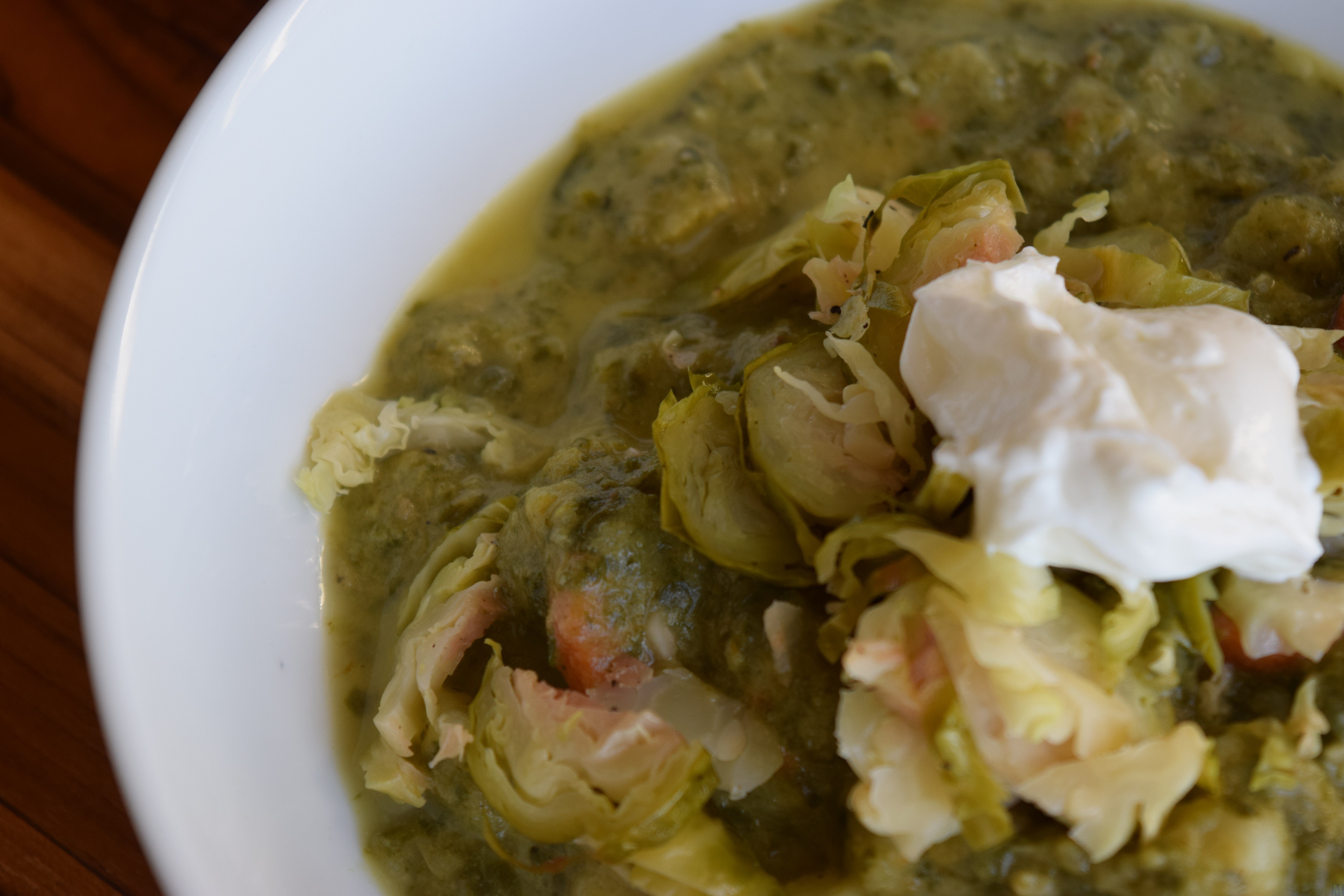 - Add cauliflower and thighs. Heat through. Add cream and heat through. (Garnish servings with roughly-chopped sprouts and a dollop of yogurt.)