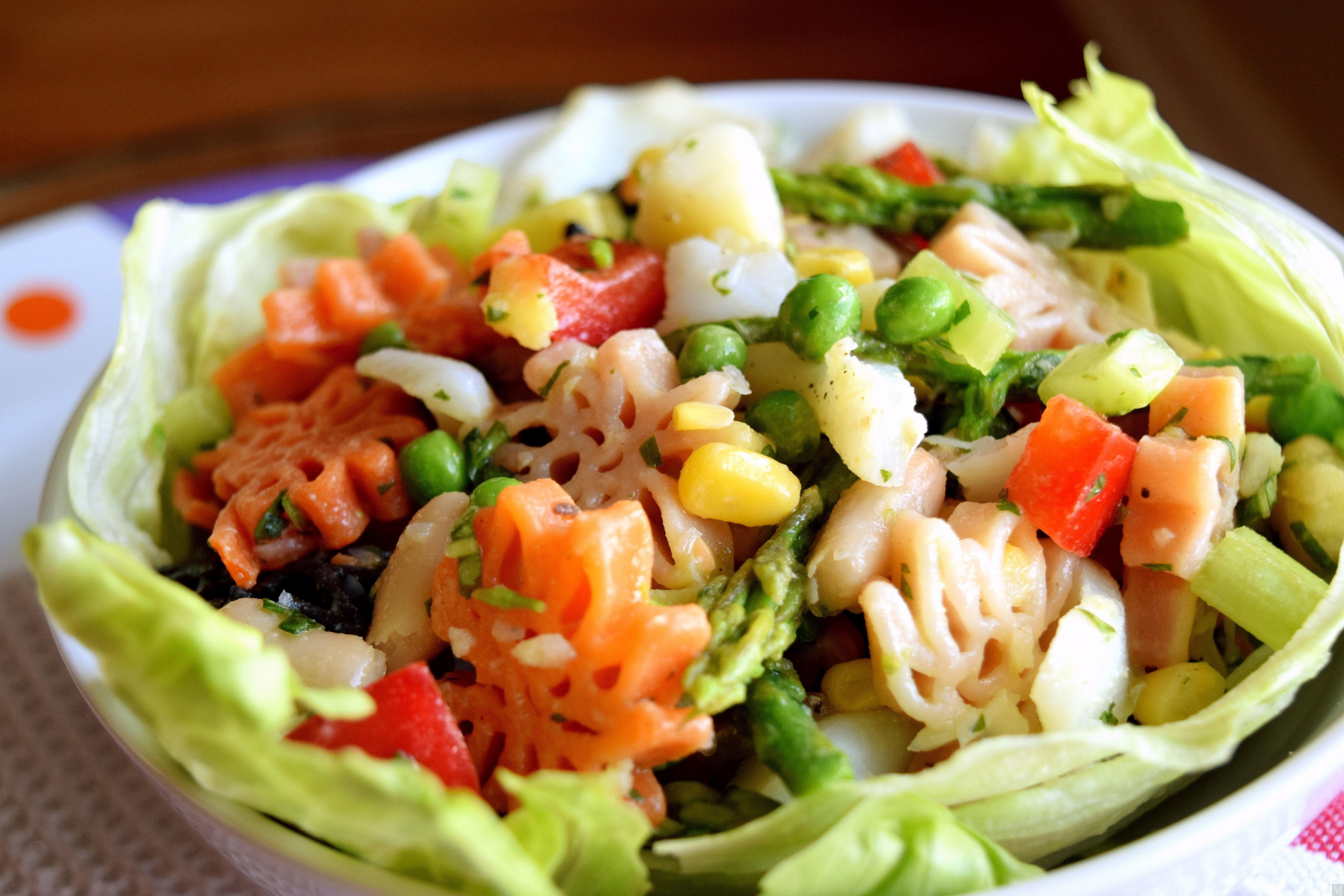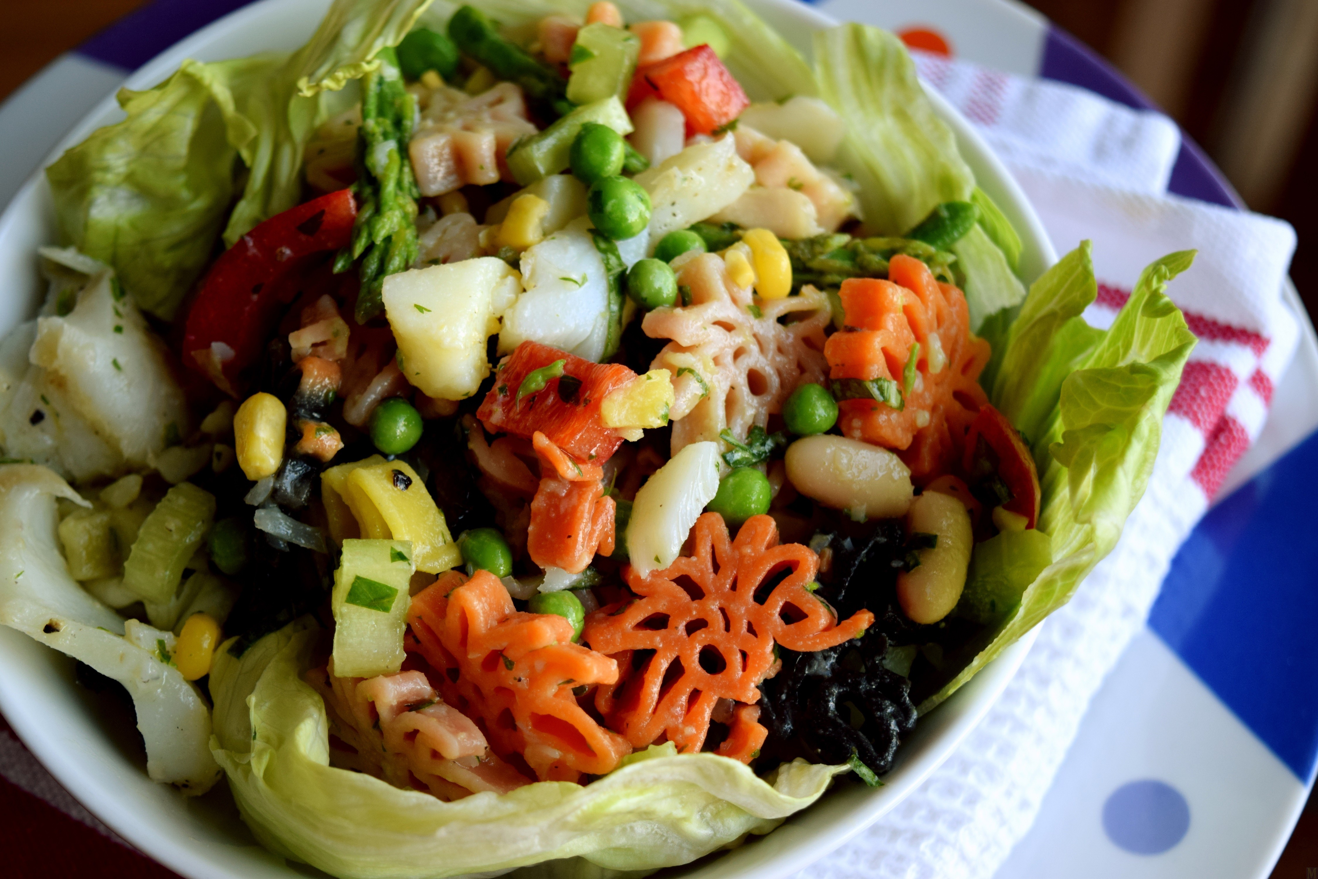 There is usually one complaint I have with salads today: they are usually over-dressed! Swimming in dressing is not my idea of delicious, that you mentioned that the recipe dresses the salad just tight makes me want to try it right away. Your unique pasta intrigues me, particularly that the colours have different flavours: they must give this summer dish a wonderful background flavour. And they are super cute too!