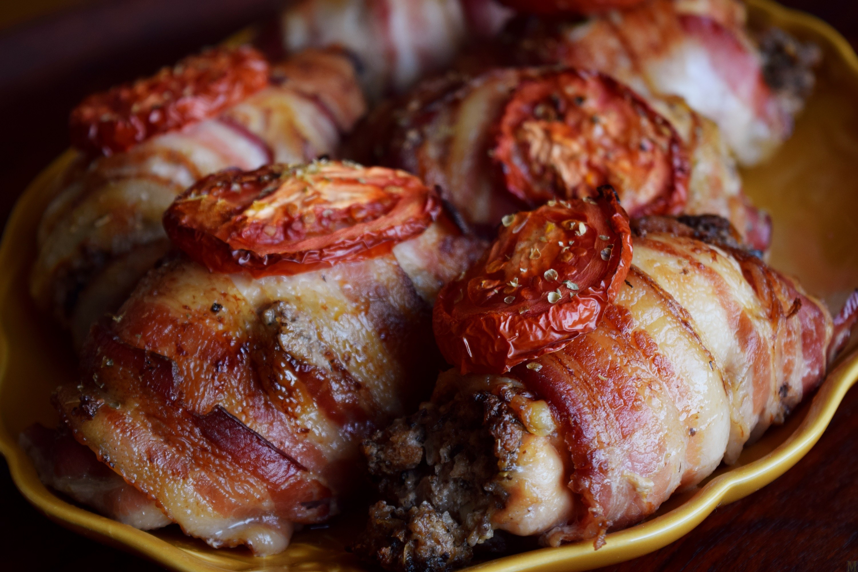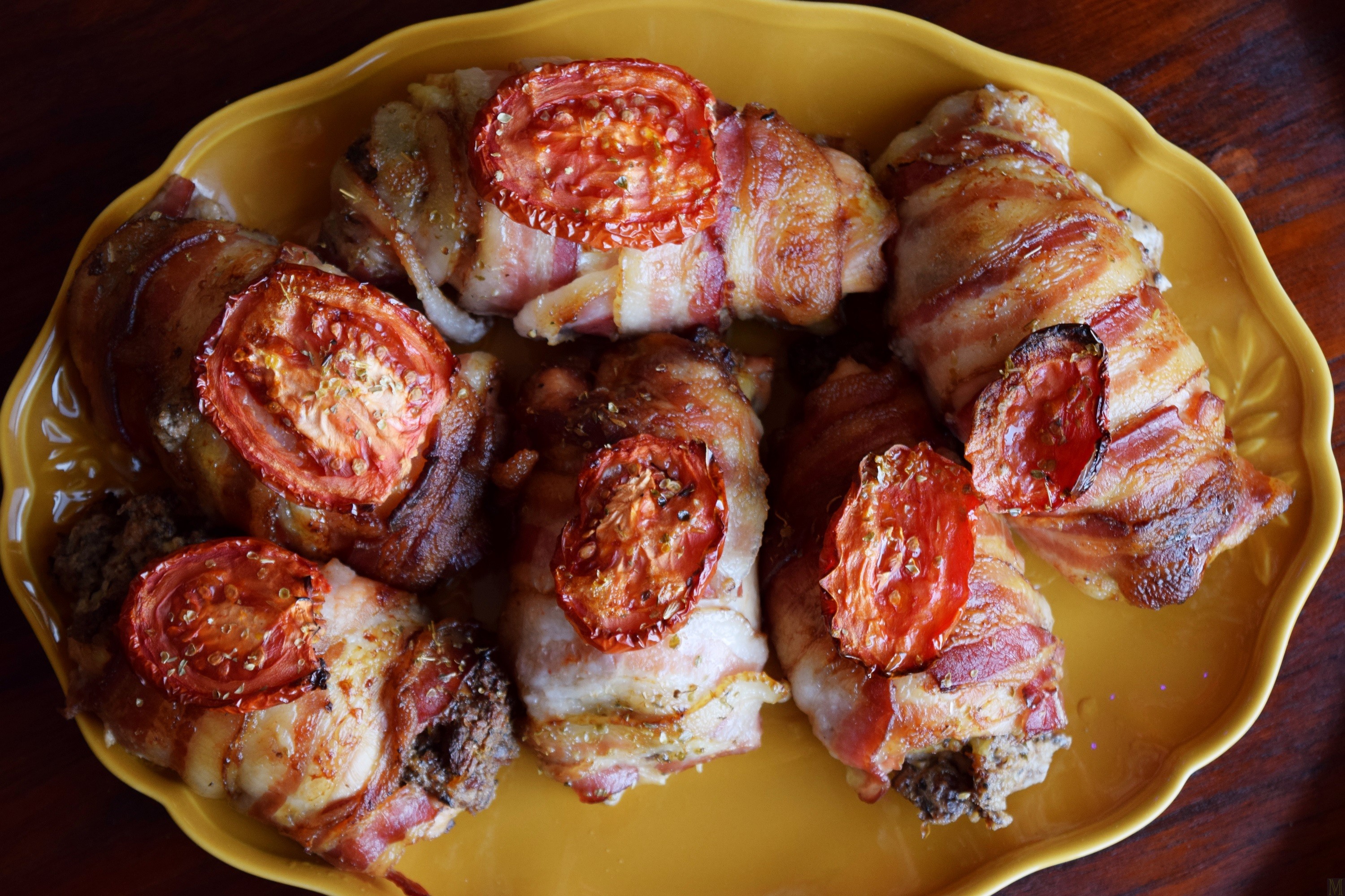 Now, isn’t everything better with bacon on it or in this case, wrapped all over it? This recipe sounds wonderful and I bet the house smelled excellent as it baked.