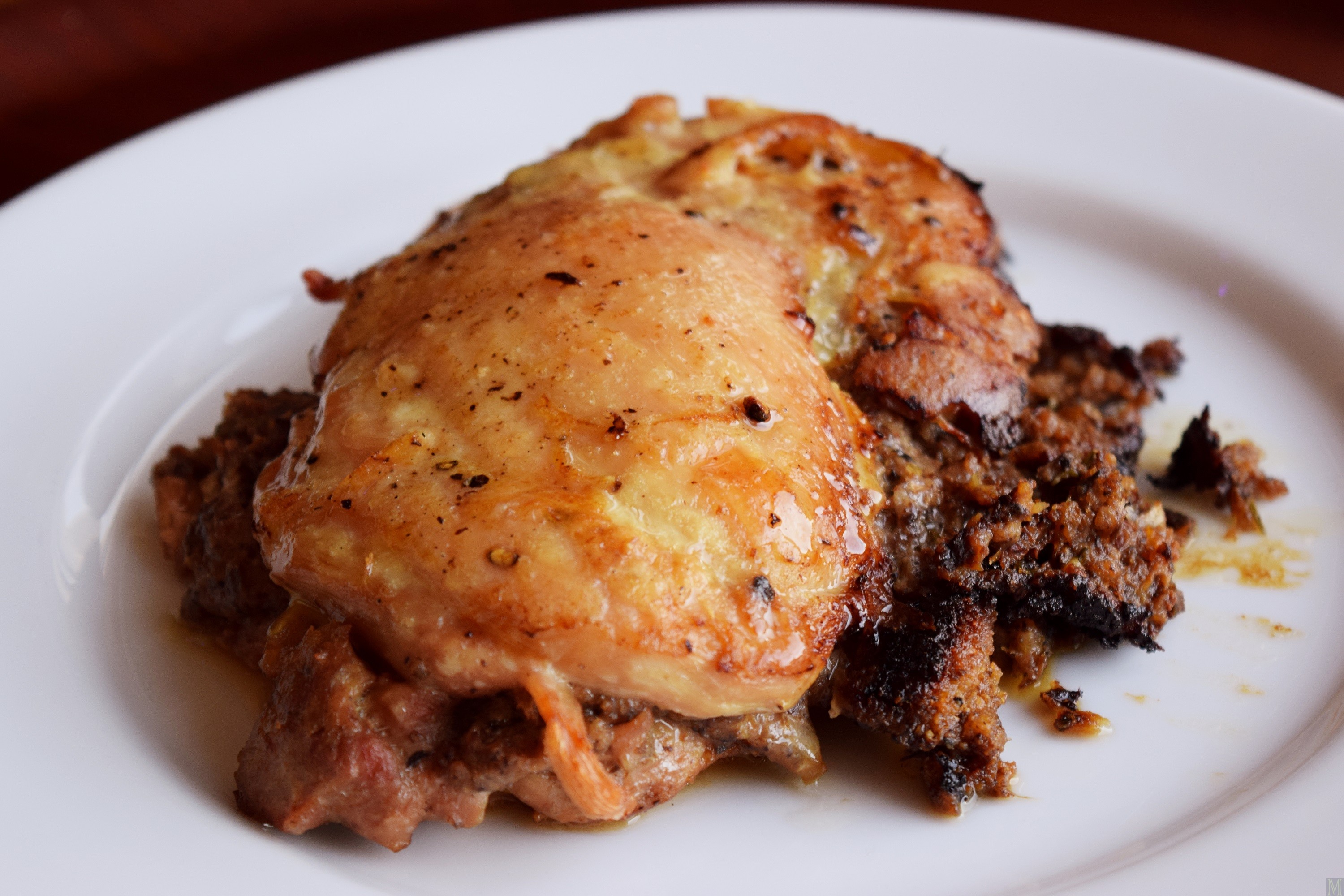 (Bacon Wrapped) Chicken Thighs Stuffed with Portobellos, Rosemary, Pistachio, and Goat Cheese