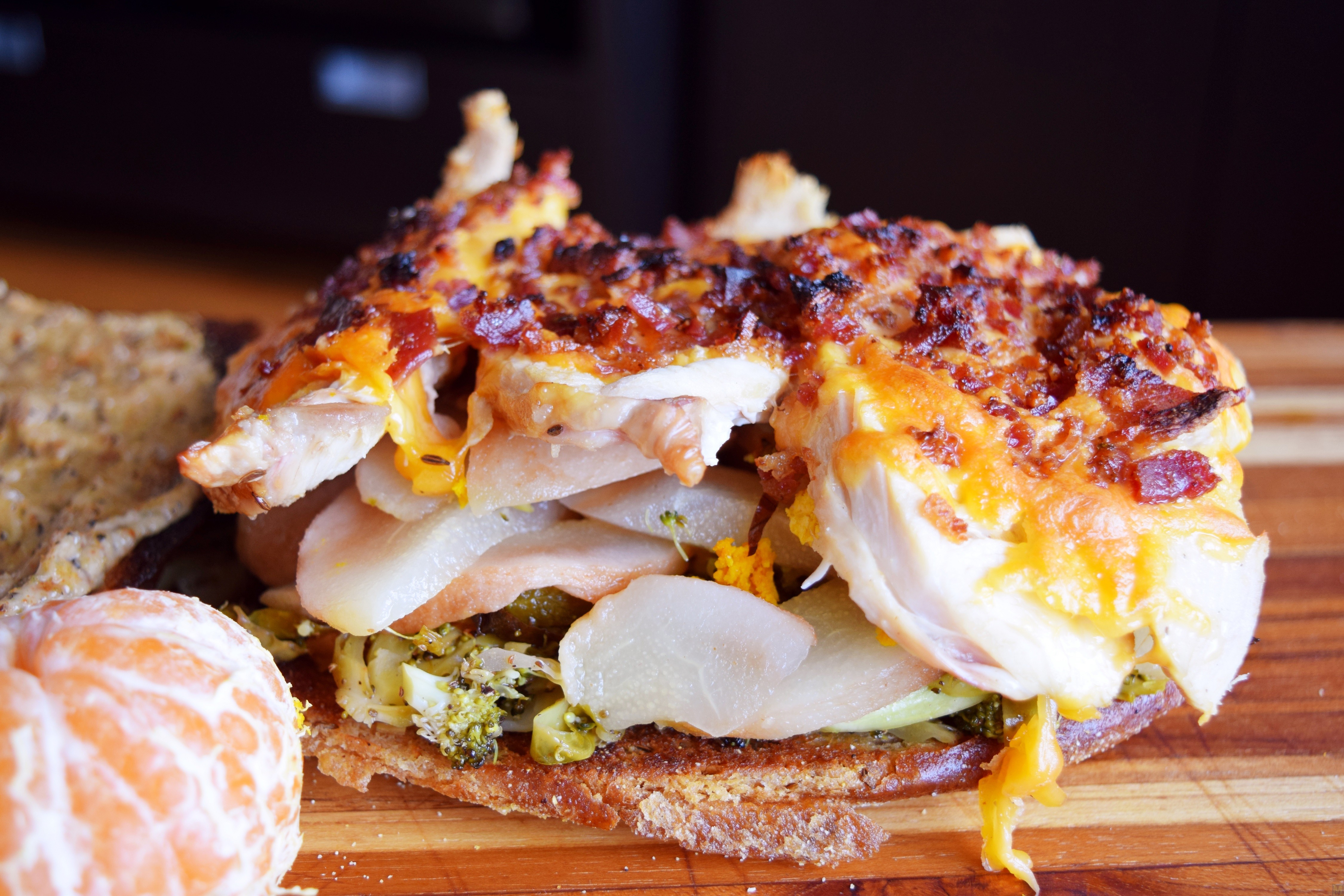 5. To assemble the sandwich, mound the sprout mixture on the bottom bread slice, top it with pears, sprinkle that with mandarin zest. Lay the broiled turkey-cheese-bacon on top. Slather the top bread slice with the seasoned mayo.